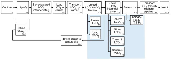 To derive the basic functions of the CO2 terminal, a functional flow block diagram was used. Since the basic functions should be connected with the entire CCS chain, the three CO2-terminal-related functions—‘6.0 Unload LCO2 to CO2 terminal’, ‘7.0 Store LCO2 intermediately’, and ‘8.0 Pressurize’ (Figure 2b)—were set as the higher-level functions.