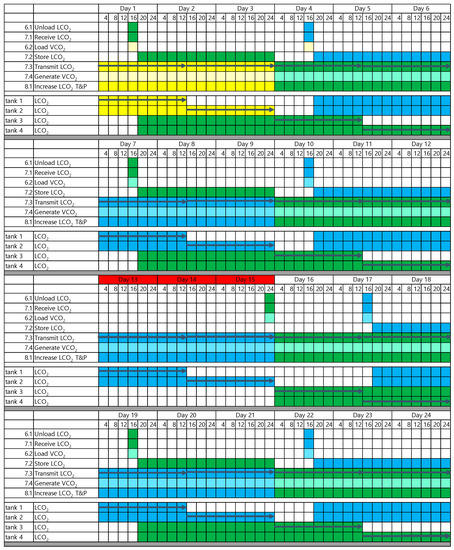 Figure 7 shows the TLA results. In Figure 7, each cell on the x-axis represents four hours, and the y-axis represents the seven functions derived in Section 4.1. The activating time of each function is specified by filling the correspondent time square in Figure 7. On the y-axis below the functions, rows are additionally inserted to show each LCO2 storage tank state and the arrows represent the transmission of CO2 to the pipeline. Each carrier shipping CO2 is distinguished by filling the time squares with green and blue colors. The yellow represents the initially filled CO2.