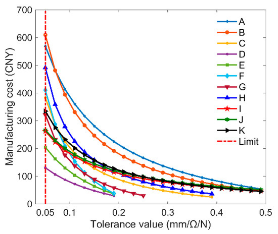 | Ci | Manufacturing cost corresponding to each input tolerance ti (CNY) |