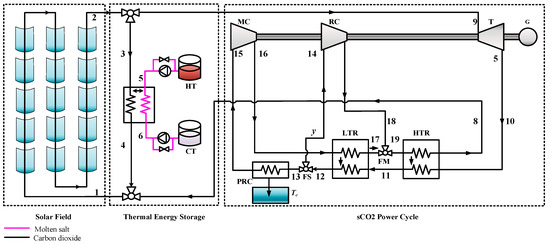 - Wang, K.; He, Y.L. Thermodynamic analysis and optimization of a molten salt solar power tower integrated with a recompression supercritical CO2 Brayton cycle based on integrated modeling. Energy Convers. Manag. 2017, 135, 336–350. [Google Scholar] [CrossRef]