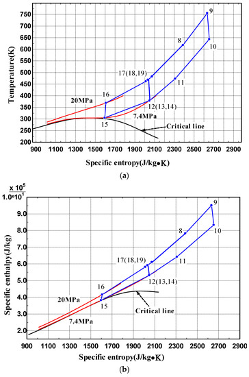 (a) T-S and (b) h-s diagram of the s-CO2 recompression Brayton cycle.