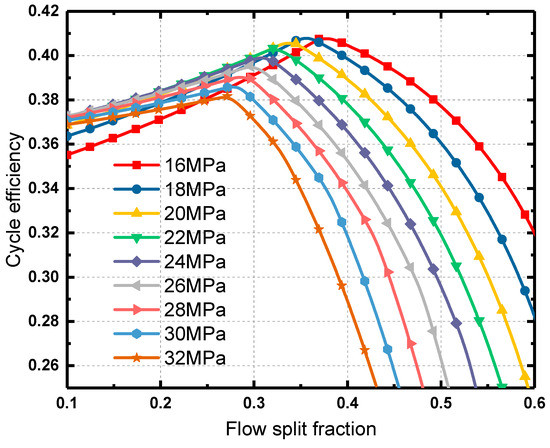 Cycle efficiency versus flow split fraction under different compressor outlet pressure values. Compressor inlet pressure is 7.4 MPa, temperature 31.25 °C and turbine inlet temperature is 487 °C.
