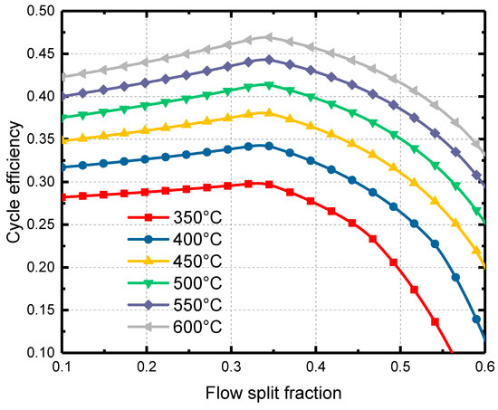 Cycle efficiency versus flow split fraction under different turbine inlet temperature values. Compressor inlet pressure is 7.4 MPa, temperature 31.25 °C and turbine inlet temperature is 487 °C.