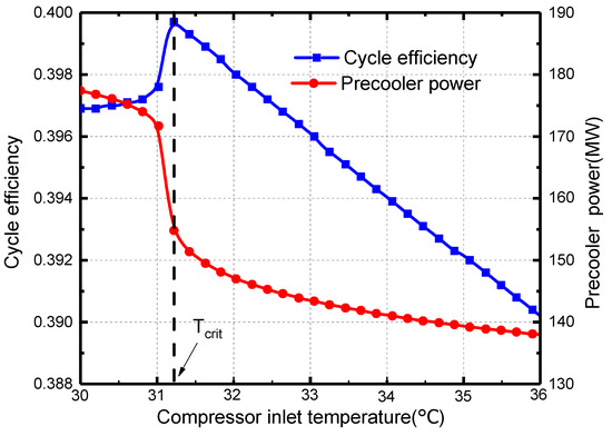 Figure 5 shows the cycle efficiency and the required pre-cooler power versus compressor inlet temperature (compressor inlet pressure is 7.4 MPa, the temperature 31.25 °C and the turbine inlet temperature is 487 °C). Increasing the cooling temperature below the critical point 31.25 °C also increases the cycle. At T = 31.25 °C the cycle efficiency reaches the maximum value of 0.3997. Beyond the critical point, the cycle efficiency drops to 0.3902 at 36 °C. The pre-cooler power drops abruptly around the critical point, but slowly after it.