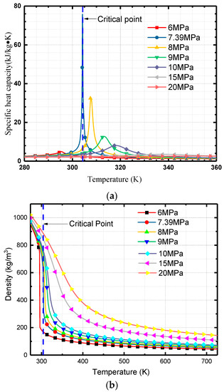CO2 density and specific heat capacity dependence on temperature and pressure. (a) Specific heat capacity, (b) density.