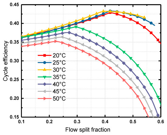 Figure 7 shows the cycle efficiency versus the split fraction during the transition from a supercritical to a liquid phase with supercritical pressure conditions at a compressor inlet temperature 20–50 °C. The peak cycle efficiency is achieved at 30 °C. In cases when liquid CO2 enters the main compressor at a temperature slightly lower than the critical temperature, this gives yields close to the peak efficiency. The cycle efficiency clearly benefits if CO2 is cooled below the critical temperature while maintaining a supercritical pressure. From Table 3 we see that the optimized flow split fraction does not much change below the critical temperature, but above the point the change increases. For example, moving from 20 to 30 °C changes the flow split fraction from 0.4184 to 0.4061, and a temperature rise to 50 °C drops the flow split fraction from 0.4061 to 0.2224. The reason for this is the high CO2 density in the liquid phase at the compressor inlet. If the compressor operates far away from the critical point, the optimized flow split fraction and cycle efficiency will not change much and the fluid properties are not much affected. This indicates that if the compressor inlet temperature deviates from the design value, it will result in a significant reduction in cycle efficiency since the cycle will be operating outside its optimized flow split fraction value.