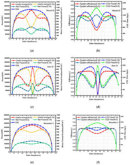 The net power output, useful energy, system efficiency and CO2 flow with two tracking modes (E-W and N-S) are depicted in Figure 9. The turbine inlet temperature is fixed to 483 °C, and the N-S and E-W tracking modes yield quite different temporal output patterns: In the N-S mode on March 22 (Figure 9a,b), the output increases from morning to noon, reaching a maximum efficiency at noon (system efficiency 0.318 and CO2 flow 2027 kg/s); in the E-W mode a minimum efficiency is reached at noon and a maximum efficiency at 9 am and 4 pm. The average daily system efficiency of the E-W mode is 0.2637 and for the N-S mode, it is 0.2787.