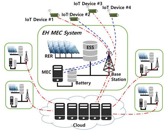 In recent years, along with the development of the Internet of Things (IoT) technology, it has become easier to connect mobile devices to the Internet [1,2,3]. In particular, IoT-based sensor devices, which have low computing performance, can overcome their computational limitations with the help of cloud systems [4,5]. However, the explosive growth of IoT data has resulted in increased traffic load in networks and cloud systems. This overload reduces the quality of experience (QoE) of the services and can result in network blackout, which shuts down the network system [6,7]. To solve these problems, the mobile edge computing (MEC) technology, which is a type of radio access network (RAN) with cloud computing capabilities, has been developed to assist resource-constrained IoT devices [6,7]. In an MEC environment, the MEC server computes the offloaded workload from the IoT devices and charges the bill accordingly. This paper proposes an energy harvesting (EH) MEC system, which enhances the survivability of the MEC through energy harvesting if the MEC is installed in a remote area where grid power supply is not available. In the EH MEC system, the MEC server is powered by renewable energy resources (RER) such as photovoltaic or wind turbine resources. Therefore, it is possible to establish a system that deploys IoT sensor nodes and collects information in places where it is difficult to install electricity facilities such as deserts or unmanned islands. However, the EH MEC system has important challenges in terms of stability. On the one hand, since the energy supply from RERs is uncertain with respect to weather or time, the EH MEC system cannot achieve stable energy unlike conventional grid powered MEC. On the other hand, if EH MEC operation only considers maximization of the system performance, system black out will occur since the power supply of EH MEC is unstable, i.e., EH MEC has to consider battery stability [8]. Thus, EH MEC reduces the energy consumption when the amount of harvested energy is not sufficient even if the system performance is decreased.