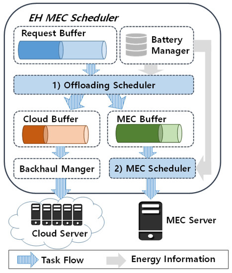 Figure 2 shows the proposed EH MEC scheduler. As shown in the figure, the proposed EH MEC scheduler consists of two sub-schedulers (offloading and MEC scheduler), three buffers (request, cloud, and MEC buffers), and two managers (battery and backhaul managers). At time t, the requests from the IoT devices are stored in the request buffer, and the request buffer is modeled as . Similarly, the MEC buffer can be modeled as
