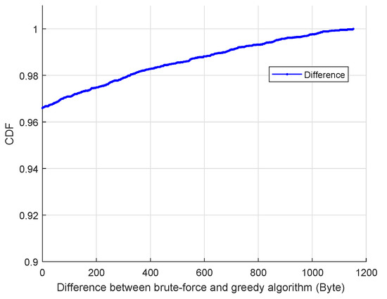 Figure 3 shows the difference in offloading bit size between the optimal solution and the greedy algorithm. As shown in the figure, the proposed algorithm guarantees more than 96% of the optimal value. Moreover, more than 99% of the difference between the greedy algorithm and the optimal solution are less than 700 bytes.