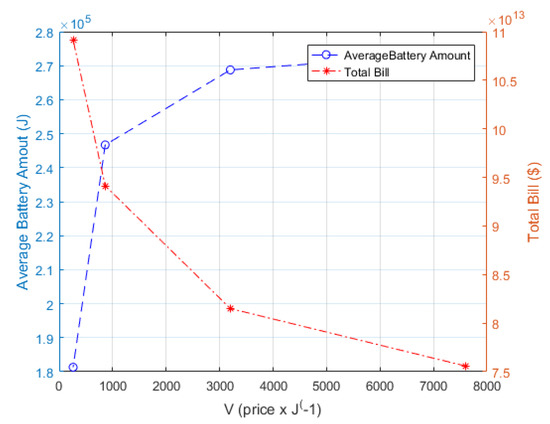 Figure 4 shows the changes in average battery amount and total bill according to V. As shown in the figure, the average battery amount increases with increasing V. On the other hand, the total bill decreases with increasing V. In the proposed optimization problem of MEC scheduling, there is a tradeoff between battery stability and the bill. Therefore, we can verify that the proposed Lyapunov-based MEC scheduling algorithm works well. In addition, the algorithm efficiently controls the priority between the battery stability and the bill.