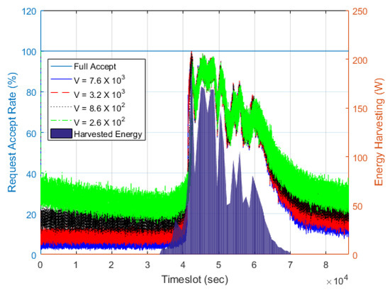 Figure 5 shows the accept ratio of offloading requests according to the timeslot. In the proposed offloading scheduling algorithm, which is presented in Section 4.1, the scheduler determines the admission of requests by considering the request deadline as well as the MEC battery stability. Therefore, the proposed scheduler increases the accept ratio if the battery is sufficiently stable. As shown in the figure, the accept ratio changes according to the amount of energy harvested. At the beginning of the simulation, the requests are constantly accepted. Then, the accept ratio rapidly increases at t = 40,000 where energy harvesting begins, and then it fluctuates according to the amount of energy harvested. In addition, a higher V indicates an increasing CPU frequency; hence, the scheduler can accept more requests. Therefore, the total bill of the MEC server increases with decreasing V, as shown in Figure 4.
