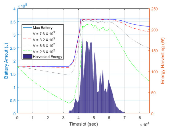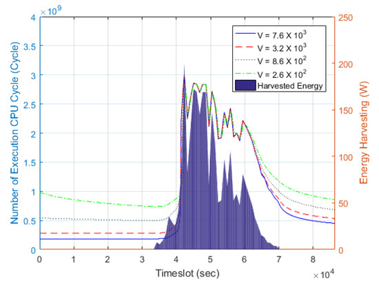 Figure 6 shows the CPU cycles according to timeslot. As shown in the figure, the proposed scheduler efficiently controls the CPU frequency according to the amount of energy harvested. This is because the increase in energy harvesting stabilizes the battery, which results in greater battery stability. Consequently, it increases the CPU frequency to accept more requests. In addition, the figure shows the difference in number of CPU cycles with V, and a higher V relatively decreases the CPU frequency to stabilize the battery more. From to t = 40,000, where the energy is not sufficiently harvested, the differences among different values of V are greater than the differences from t = 40,000 to t = 60,000, where the energy is sufficiently harvested. This is because, when the battery is not sufficiently stable, the offloading scheduler increases the number of rejected requests, and the MEC scheduler schedules the frequencies differently according to V. When the battery is sufficiently stable, however, the offloading scheduler increases the number of accepted requests and the MEC scheduler increases the CPU frequency to the maximum depending on the consumption of the battery, i.e., the CPU frequency is maximized depending on the boundaries that the battery can support.