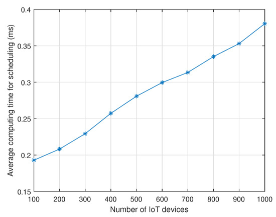 The evaluation measured the computation time of the proposed scheduling algorithm to verify its applicability. Figure 8 shows the computation time of the proposed algorithm against the number of IoT devices. As shown in the figure, the computation time is less than 0.4 ms when the number of IoT devices is 1000. In addition, the computation time increases linearly with the number of IoT devices. Thus, the complexity of the proposed scheduling algorithm is linear with the number of IoT devices. This is because the proposed scheduling algorithm is designed based on Lyapunov drift optimization, which can solve the problem in polynomial time. Therefore, the proposed algorithm can schedule the computation offloading sufficiently in real-time.