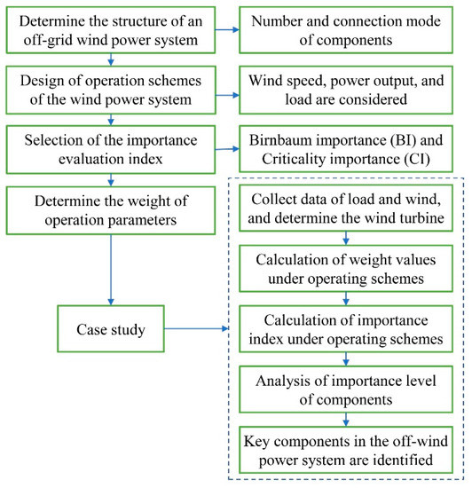 Exploitation of renewable energy sources (RESs) has been prioritized around the world since the “energy crisis” of 1970s [1,2,3]. Among the RESs, wind power has become more attractive due to its short gestation period, mature level of technology, and negligible environmental pollution [4,5,6,7]. Consequently, many countries have set strategic plans to develop technologies for supporting sustainable wind power development, especially in areas with rich wind energy sources [8]. However, off-grid wind power systems have greater advantages in remote places such as mountainous areas, islands, coastal areas, and other places where wind energy is abundant and where it is temporarily unable to achieve grid-connected power supply [9,10,11]. The reliable and safe operation of wind power systems is one of the key factors for power transmission and distribution [12]. In the design phase of a wind power system, the importance calculation is needed to help the designer to identify the weak points of the system and provide support for the reliability improvement and optimization design. In the operation phase, the maintenance resources are reasonably assigned through the importance analysis to ensure that the maintenance cost is reduced and the system is in normal operation [13]. Therefore, importance analysis is a key factor in the reliability design and evaluation of wind power systems.