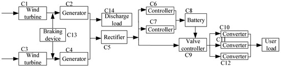 The composition (Ck) of a general off-grid wind power system is given in Figure 2, which includes wind turbine, braking device, permanent magnet synchronous generator, rectifier, controller, battery, valve controller, converter (include DC booster and inverter circuit), user load, and discharge load. The valve device is available for controlling valve opening or closing according to the system’s operations. The wind turbine operates when the wind speed raises above the designed cut-in speed and stops when the wind speed is below the designed cut-in speed. In such a case, the battery group would be used to meet the user demands. When wind turbine is operating, the generated AC power would be supplied to meet the requirement of user load, and any surplus electricity would be stored in the battery as a backup. With response to wind power generation, there is an inherent relationship among various sectors. Normally, the changes in the wind speed, storage capacity, and energy load would bring about variations in the system energy transfer or operating conditions. Therefore, it is particularly desired to develop comprehensive strategies for supporting wind power generation.