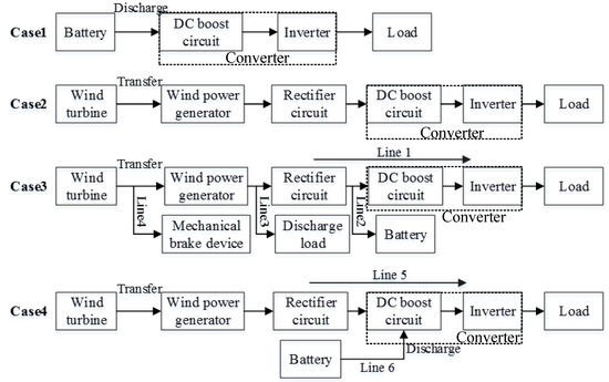Case 1 (Ω1): when the wind speed is lower than the cut-in speed, the wind turbine in the off-grid wind power system will fail to capture the wind energy. No electricity can be generated in this case. The battery should be started through a DC booster and inverted circuits to satisfy the load demand.
