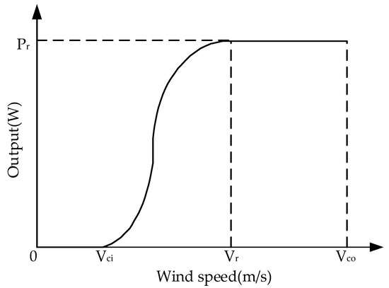 There is a nonlinear relationship between wind power output and wind speed, and that relationship can be described by the corresponding operational parameters of the wind turbines. The relationship between wind speed and wind power output is given in Figure 4, and the power output is expressed as Equation (14) [35].