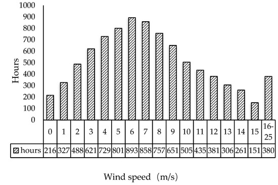 In this study, an off-grid wind power generation system is established by taking household electricity as an example. The daily average electricity consumption of a family is about 0.63 KWh, and the annual average is about 227 KWh (Table 3). The wind turbines are required to supply more than 65% of annual electrical power consumption for this family consumer. Besides, data of monthly average wind speed and frequency distribution are collected, as shown in Table 4 and Figure 5.