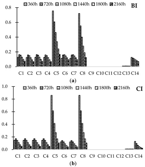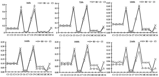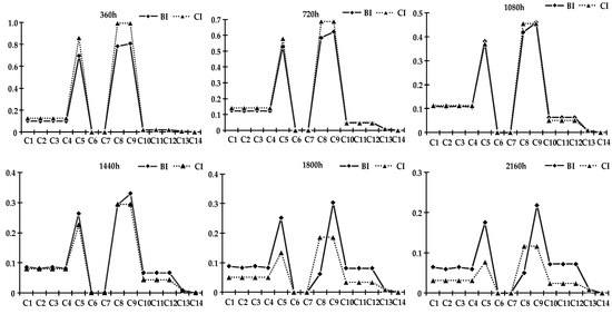 Figure 8 displays the BI and CI values for components at the optimal solutions as the supply and demand is balanced (PN = Pout). Importance levels of the components evaluated by the two methods are the same. The results of components C6, C7, and C14 are zero because of their absence during system operation. From the figures, the importance levels of components of C5 and C9 are prominent, especially component C9, leading to a greater influence on the top event of the system. Thus, the characteristics of components C5 and C9 can be assumed as (A). The BI and CI values of components C10, C11 and C12 are the same due to their similar features, and that of components C1, C2, C3 and C4 also tend to be consistent but their values are larger than that of components C10, C11 and C12. In terms of the characteristics, the above seven components can be assumed as (B). Importance of component C13 ranks in the last position, mainly because it does not work frequently under normal circumstances attributed to its special nature for the entire system. The characteristics of component 13 can be assumed as (C) or not labeled while processing. Generally, from the time variation trend of the importance of the components, it can be concluded that each system component has maximum time during which there is a significant impact on the overall operation of the system. After this time, the importance of the component is getting smaller, and the maximum time node of each component is different, which is related to the average failure time of the components.