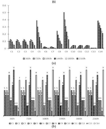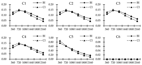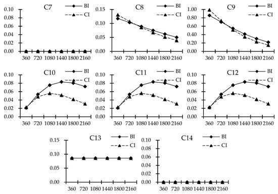 When PN = 0, the BI and CI levels of 14 components at different operational durations are shown in Figure 6. The results from the two evaluation approaches present the same importance rankings of the system components. Apparently, the importance level of components C5 and C8 are obviously larger than other components, so they are marked as key characteristics [A]. This highlights the fact that special attention needs to be paid to these components during the system maintenance. Components C1, C2, C3, C4, C6, and C7 have similar importance values. They are normal objects during the system maintenance and are marked as significant characteristics [B]. Due to the peculiarity of the system function, components C13 and C14 are not required to work frequently in the normal situation. Hence, they are ranked the lowest importance level as general characteristic [C]. As there is no electronical load demand, the energy generated by the wind only charges the battery until full. In this case, the components C9, C10, C11, and C12 do not work, so the BI and CI values are zero. It means that they have little effect on the system. From the perspective of runtime, the importance of the components decreases continually with longer running time. However, the rankings on the importance of the components remain unchanged. In addition, after taking the operational status of the multi-group in the system into account, there is no significant linear relationship between the importance of the components and their reliabilities or failure rates. That is, the importance of the components cannot be ascertained from their reliabilities or failure rates. This is a significant difference from the single-group operational status of the system.
