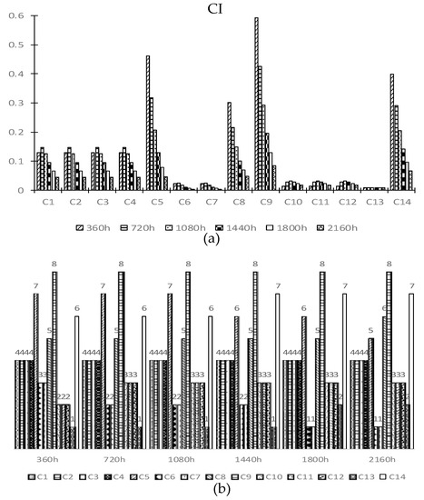 CI values (a) and ranking bar charts (b) of the 14-component system when PN is less than Pout.
