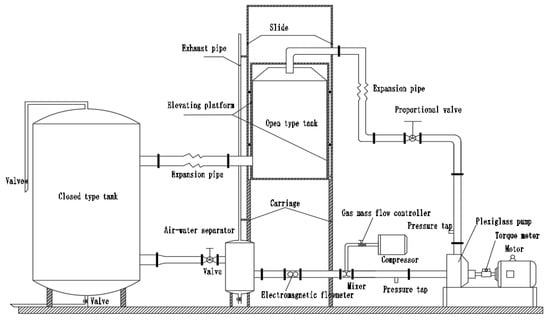 An open-type test loop was built to assess the pump performance and inner flow visualization measurement. As shown in Figure 1, the air injection system was able to provide 0.2 mm diameter bubbles using a specific compressor device (more details can be found in Si et al. [,]. The dehydrated air flow rate was measured and controlled by micro-electro-mechanical flow sensors systems (Bürkert 8107), which could supply a constant air mass flow rate in standard conditions value (25 °C, 101,325 Pa). The air-water mixed flow was sucked to the pump inlet, went through the flow passage, and reached the upstream open-type tank by using the valve to regulate the flow rate. The open tank allows air bubbles to be separated from the water rarely entering the closed-type tank (downstream tank). Flow rate of the pure water obtained after the second separation was measured by an electromagnetic flowmeter set between the separator and the mixer. Pump performance, such as head and global efficiency values, were obtained following ISO 9906:2012 [].