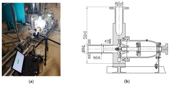 Views of the experimental set up and the transparent pump model. (a) Test scene and (b) drawing of the pump assembly dimensions (mm).