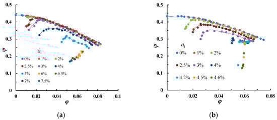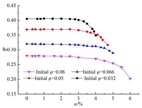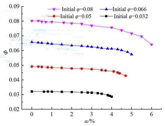 Figure 6 shows how the flow rate was modified when inlet void fraction increased with an impeller rotating speed of 1450 m/min. Depending on the initial water flow rate (single water phase), the flow rate decreased. This feature was more pronounced under higher flow rate coefficients. The curve was constant until the αi was less than 3% when it started to drop sharply. This can also be observed for the pump head coefficient in Figure 7.