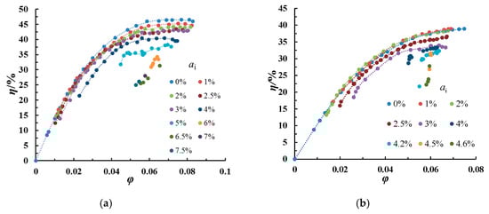 Figure 3 and Figure 4, respectively, show the overall pump head coefficient ψ (Figure 3a,b) and global efficiency η (Figure 4a,b) versus the flow coefficient φ for two rotational speeds. The values of the two rotational speeds (1450 r/min and 1000 r/min) were chosen to verify the affinity laws. The consequences of increasing the values of αi on pump performance were that both head and efficiency degraded for both of the two rotational speed. Low flow rate was more sensitive to air content. The degradation slope increased with the decreasing flow rate coefficient when αi increased. The pump performance degradation at 1000 r/min was worse compared to 1450 r/min, which means that the affinity laws for the pump performance under a higher void of gas-liquid two-phase flow was no longer valid. This result is quite well-known since rotational speed is an important factor that allows the pump to work better when handling two-phase flow.