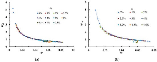Theoretical head coefficients ψth are given in Figure 5 for both rotational speeds. Both images show the same theoretical head coefficient change for one-phase flow conditions (only water). However, global efficiency decreased for the lowest rotational speed because of a low Reynolds number (based on impeller outlet speed and radius) that may reach a limiting value of 105 for flow rates below 70% of nominal conditions. A unique curve was obtained for all inlet void fraction values up to 5% for 1450 r/min and 4% for 1000 r/min. Explanation of such an important result can be found in Si et al. [,]. These values also corresponded to severe pump head degradation that can be observed for a flow coefficient range value between φ = 0.055 and φ = 0.065.