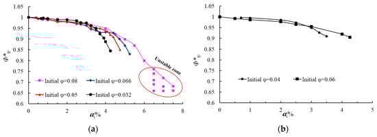 A more interesting analysis was performed using the dimensionless flow coefficient degradation ratio Φ*tp, defined as φtp/φ0 and shown in Figure 8, for the two different rotational speeds. Some slight modifications of the curve slope can be observed for different inlet void fractions depending on the initial flow rate conditions. Two distinct zones can be observed: the first one corresponds to αi between 0% and 4% for n = 1450 r/min and from 0% to 3% for n = 1000 r/min. The smaller the initial flow rate, the smaller the flow rate degradation for both rotational speeds. For higher values of the inlet void fraction (second zone), the slope is much important and a sharp decrease in the liquid flow rate can be observed. This decrease is less pronounced when the initial flow rate is big, which is consistent with the conclusion reached by several authors like Murakami et al. [] and Minemura et al. []. A liquid flow degradation of 10% was obtained at αi = 3.5% for the lowest flow rate at 1000 r/min (Figure 8b), whereas this amount progressively reached 5% for the design flow coefficient at 1450 r/min (Figure 8a). The pump started to be quite unstable for a flow coefficient of 0.08 and around αi = 7% at 1450 r/min. When the rotational speed was lower, the same behavior could be found with a more limiting value of the maximum allowable inlet void fraction due to the reduced rotational speed.