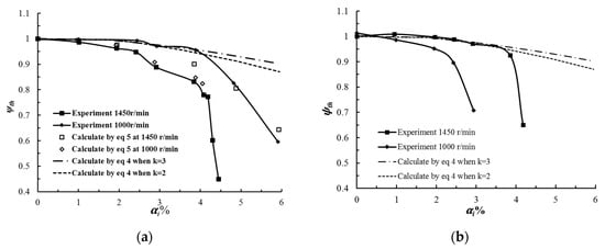 Flow coefficient degradation ratio for two rotational speed: (a) n = 1450 r/min and (b) n = 1000 r/min.