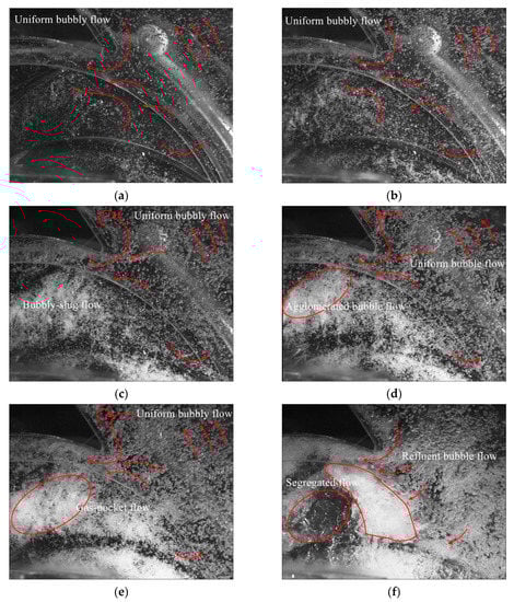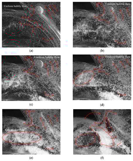 Flow pattern under φ = 0.06 for different αi: (a) 0.5%; (b) 1%; (c) 2%; (d) 3%; (e) 4%; (f) 4.2%, pump shut off condition.