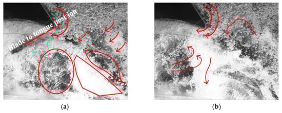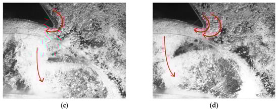 The last set of images (Figure 12a–d) presents the instantaneous flow patterns for four different impeller blade positions, just before pump shut-off conditions were reached, where T is the time period of the impeller tips passing through the tongue region. Figure 12b corresponds to the same impeller blade position that is shown in Figure 10 and Figure 11 so that Figure 12b is equivalent to Figure 11b. Looking first at Figure 10 and Figure 11, it is obvious that the flow pattern looks a little different because these conditions were quite unsteady. The four instantaneous images show how strong the reverse flow was near the tip gap impeller shroud. Both segregate flow and water structures were simultaneously transported in the tangential direction (due to the impeller rotation) and in the inward radial direction due to the strong reverse flow occurring in the shroud gap region. As a consequence, three-dimensional separated flow vortices were observed up to the pump inlet location. This two-phase flow pattern of migration is believed to be the pump surge shut-off starting point.
