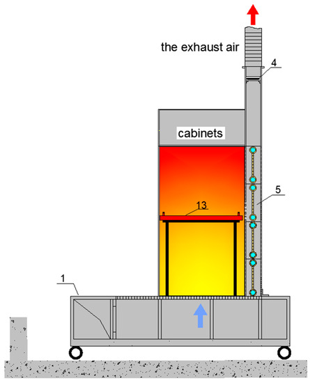 Schematic of the proposed system: 1―Movable downside air supply system; 4―The top exhaust fan; 5―The rear door heat exchanger; 13―The built-in analog heat source.