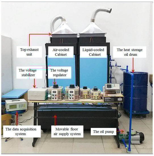 In order to study the heat dissipation performance of the cabinet-level RDHE system, a novel testing rig was constructed in Guangdong University of Technology, China, as shown in Figure 3 and Figure 4. The test rig was mainly composed of three parts, namely the communication cabinet module, the heat dissipation system and the data acquisition system. The communication cabinet module consisted of two rack modules and a built-in analog heat source control system. The built-in analog heat source system included a voltage stabilizer, a voltage regulator and a PTC electric auxiliary heater. The heat dissipation system consisted of the RDHE system and an air-cooling system. Four finned oil tube exchanger, oil pump, heat storage oil drum and oil circuit system made up the RDHE system. The air-cooling system consisted of a movable downside air supply unit and a cabinet top exhaust unit. The data acquisition system included a multi-channel temperature and humidity monitor, a multi-channel temperature recorder and a power detector.