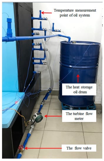 The two rack modules were made of 640 mm × 600 mm × 1050 mm traditional iron materials. In order to accurately calculate the heat dissipation capacity of the heat dissipation system, the surface of the rack was insulated with 20 mm thick insulation cotton, the outer door of the cabinet was made of 4 cm thick extruded board. The analog heat source system firstly regulated the circuit through the voltage stabilizer, and then adjusted the voltage regulator to control the PTC electric auxiliary heater to achieve different heating density conditions. The oil circuit system used a DN25 mm pipe for cooling oil delivery. In order to ensure the safe operation of the oil circuit system, the pipeline was equipped with a filter valve, a check valve, a flow valve and a turbine flow meter. The pipes connecting each oil-cooled radiator were transparent pipes, and the operation condition was checked regularly. The air-cooling system was coordinated by a movable downside air supply unit and a top exhaust unit of the cabinet, and the wind speed of the fan could be adjusted by a voltage regulator. Finally, the axial fan exhausted the hot air generated during the experiment through the galvanized pipe with a diameter of DN25. A multi-channel temperature recorder collected the temperature of the oil system, the temperature of the heat storage oil drum, and the internal temperature of the cabinet, and the temperature and relative humidity of the inlet air and the hot air of the cabinet were collected through a multi-channel temperature and humidity monitor. The performance parameters of main components were listed in Table 1.