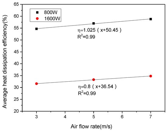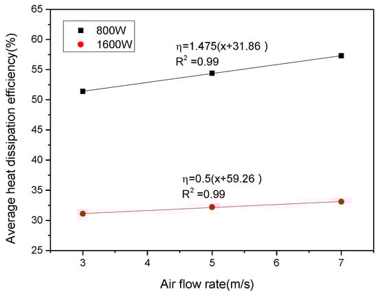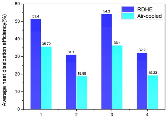 Next, the average heat dissipation efficiency of the RDHE will be calculated, and the average heat dissipation efficiency could directly reflect the heat dissipation of the device. The average heat dissipation efficiency was calculated according to Equation (6):