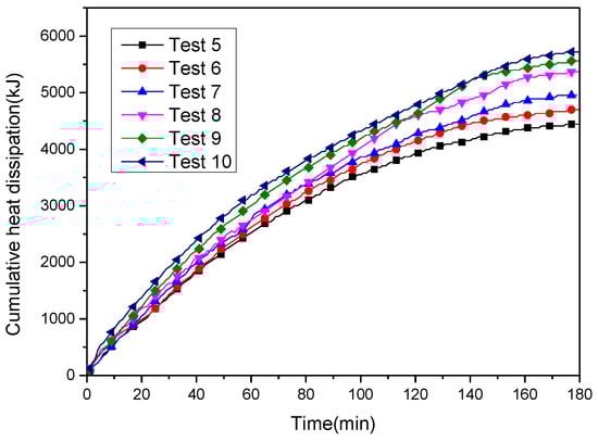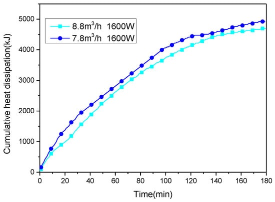 The cumulative heat dissipation of the RDHE was mainly calculated by the temperature rise of the oil in the heat storage oil drum, and the cumulative heat dissipation of the device was calculated according to Equation (1). Table 7 showed the cumulative heat dissipation of the heat storage oil drum under different working conditions. When the simulated heat source power in the range of 800–1600 W, the average cumulative heat dissipation of the RDHE could reach 5226 kJ, and when the heat source power was 1600 W, the maximum could reach 6009 kJ.