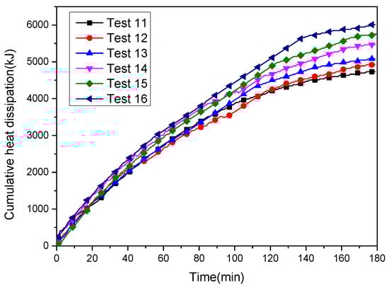 The entire experimental test time was 3 h. In order to study the trend of heat dissipation of the RDHE with time, the experimental results of the test 5–16 were taken as an example. It can be seen in Figure 10 and Figure 11 that in the early stage of the test, the heat dissipation rate of the RDHE increased rapidly, and the growth gradually became flat during the test period, and finally the heat dissipation amount tended to be stable. Choi et al. [] pointed out that the operating temperature of the CPU is generally lower than 70 °C. Bar-Cohen [] found that when the CPU operating temperature exceeded the allowable operating temperature, the reliability of the chip was reduced by 10% for every 2 °C. Through the data acquisition system, it was found that the final temperature in the cabinet is as shown in Table 8 after three hours of operation. Under the heat dissipation work of the RDHE, the temperature of the cabinet could be lower than 70 °C, and the maximum was 50.9 °C, which indicated that the heat dissipation of the RDHE is more effective and can maintain good operation inside the cabinet.