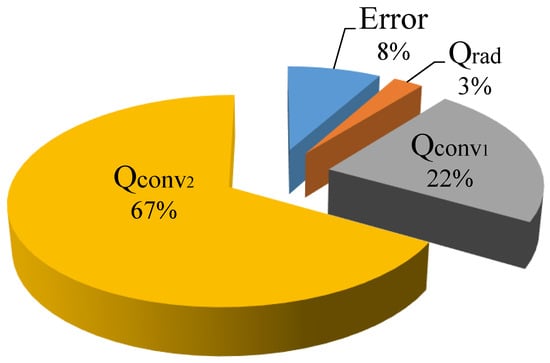 During this experiment, the convection heat transfer consisted of two parts. The first part was that the hot air inside the cabinet transfers heat to the RDHE through heat convection, this part was named . The other part was that hot air transfer heat to the inner wall of the cabinet through heat convection, this part was named . These two parts of heat could be calculated by the following formula: