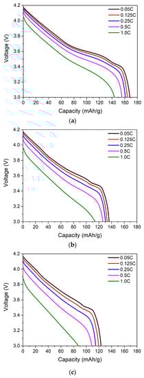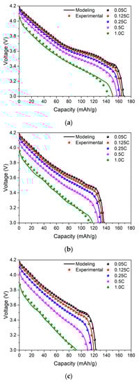 Comparison between experimental and modeling discharge curves with discharge rates ranging from 0.05 C to 1 C for the LIB cells with three different levels of the loss of cyclable lithium: (a) 0%; (b) 10%; and (c) 20%.