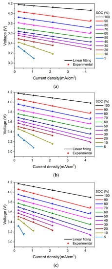 The experimental data of Figure 2a–c can be converted to the cell voltage as a function of applied current density during discharge as shown in Figure 3a–c, respectively. The cell voltage data are fitted fairly well with a linear function of applied current density, which justifies the use of the functional relationship of Equation (9) between the cell voltage and applied current density.