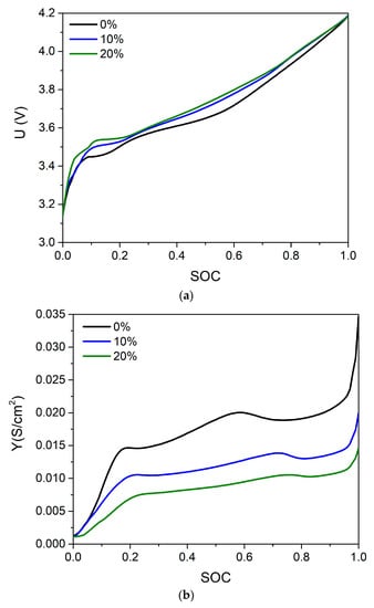 (a) U as a function of state of charge (SOC); and (b) Y as a function of SOC for the LIB cells with three different levels of the loss of cyclable lithium of 0%, 10%, and 20%.