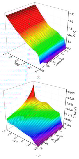 In order to estimate the discharge behaviors of an LIB cell for a broader range of the loss of cyclable lithium other than those in Figure 5a–c for which the experiments are performed, U and Y are calculated as functions of SOC and the loss of cyclable lithium by using the kriging method. The kriging method is widely used in geostatistical science and the software library is open to the public [45]. The kriging method provides an optimal interpolation or extrapolation for the unknown values of the function with multiple parameters from the observed data at known locations based on regression. In this work, the functional relationships between U, Y and the SOC values for the three different levels of the loss of cyclable lithium in Figure 4a,b are provided as input to the kriging software and the kriging software generates the U and Y as a function of SOC for the loss of cyclable lithium, other than the three levels of the loss of cyclable lithium in Figure 4a,b. These results are given as the three-dimensional surface plots of U and Y as functions of SOC and the loss of cyclable lithium in Figure 6a,b.