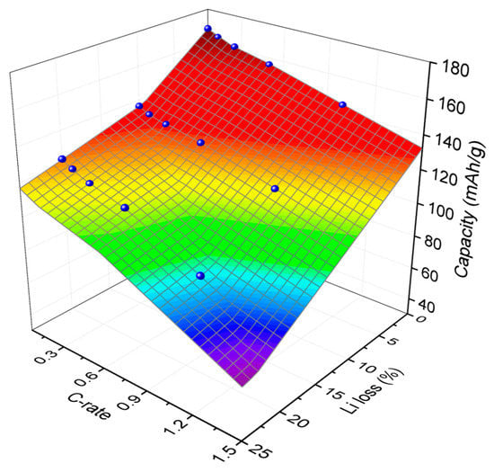 Three-dimensional surface plots of the discharge capacities as functions of SOC and of the loss of cyclable lithium. The spheres are the experimental data.
