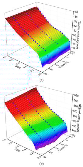 The available discharge power of an LIB cell depends on many factors including the discharge rate, SOC, and aging of the battery cell as well as cell chemistry. Because the loss of cyclable lithium is one of the main causes for the aging of LIB [19,20,21], the available discharge powers are calculated as a function of SOC and the loss of cyclable lithium for the discharge rates of 0.05 C and 0.5 C and the results are shown in Figure 8a,b, respectively. The available discharge power decreases as SOC decreases at a given discharge rate, because the LIB cell voltage declines as SOC decreases during discharge. At a low discharge rate of 0.05 C, the effect of the loss of cyclable lithium on the discharge power is not significant as shown in Figure 8a. As the discharge rate increases up to 0.5 C, the effect of the loss of cyclable lithium on the discharge power is more pronounced than that of the discharge rate of 0.05 C as demonstrated in Figure 8b.