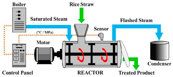 HT was performed in a 200-L pilot-scale hydrothermal reactor. Figure 1 shows a schematic diagram of the pilot-scale HT facility. To begin with, about 6 kg feedstock (in dry weight) was supplied to the reactor. Later, saturated steam was injected into the reactor from the boiler until the temperature and pressure of the reactor reached 180 °C and 1.0 MPa, respectively. Then, the feedstocks were mixed for around 30 min inside the reactor using blades installed within. The reason for selecting this condition is that, in this condition, water behaves like subcritical water, which is an excellent medium for a fast, homogenous, and efficient reaction. Also, in this condition water shows low viscosity and high organic solubility [30]. When the treatment was completed, steam was flashed through the condenser by decompressing the reactor. Later, the condensed liquid was collected in a pot and sent to the wastewater treatment facility, as it contained chlorine and organics that might have been harmful. Finally, the treated feedstock was released by using rotating blades installed inside the reactor. In the end, the treated product was cooled down, mixed, and preserved at 10 °C.