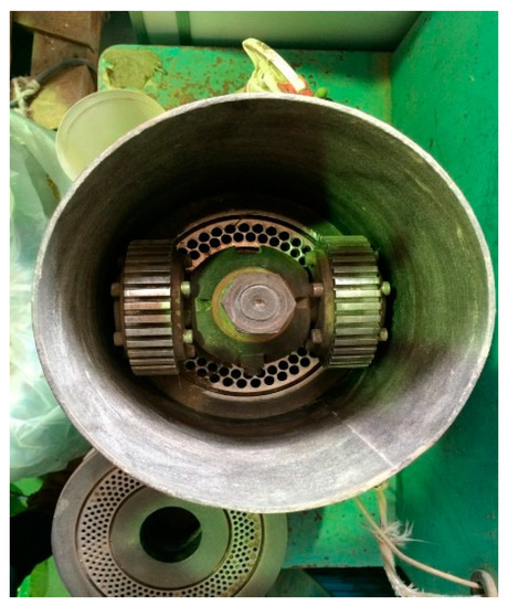 The pilot-scale flat die pellet machine (AMSPLM 300 Electric Flat Die) used in this experiment is shown in Figure 2. At first, the feedstock was supplied in the pellet machine. After that, it was compressed using a roller against a warm metal plate called a die., The feedstocks were squeezed through the tiny holes of the die at 180 °C temperature and 200 MPa pressure. Next, pellets were sliced into predefined lengths as they exited the die, using a blade. The pellets that exited the die were hot (around 150 °C) and relatively soft. Therefore, before using these materials, cooling and drying were required and achieved by blowing air through the pellets. Later, to enable uniform moisture distribution in fuel pellets, pellets were kept in a conditioning room for 72 h with a temperature of 28 °C and a humidity of 65%.